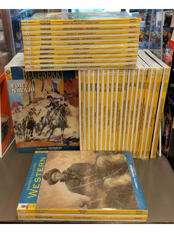 Serie completa di 90 numeri incentrata sul fumetto western franco-belga. - Blueberry (1-26) di Jean-Michel Charlier e Jean Giraud (Moebius) - Comanche (27-34) di Greg (Michel Regnier) e Hermann Huppen - Mac Coy (35-45) di Jean-Pierre Gourmelen e Antonio Hernández Palacios - Ringo (46-47) di William Vance e Jacques Acar - Trent (48-51) di Rodolphe Daniel Jacquette e Leo (Luiz Eduardo De Oliveira) - Cartland (52-56) di Laurence Harlé e Michel Blanc Dumont - Chinaman (57-61) di Serge Le Tendre e Olivier Ta (TaDuc) - Ethan Ringler (62-64) di Denis-Pierre Filippi e Gilles Mezzomo - Buddy Longway (65-74) di Derib (Claude De Ribaupierre) - Jerry Spring (75-85) di Jijé (Joseph Gillain) - Undertaker (86) di Xavier Dorison e Ralph Meyer - Lupo della Pioggia (87) di Jean Dufaux e Rubén Pellejero - La Stella del Deserto (88) di Stephen Desberg e Enrico Marini - Sykes (89) di Pierre Dubois e Dimitri Armand - Western (90) di Jean Van Hamme e Grzegorz Rosinski |