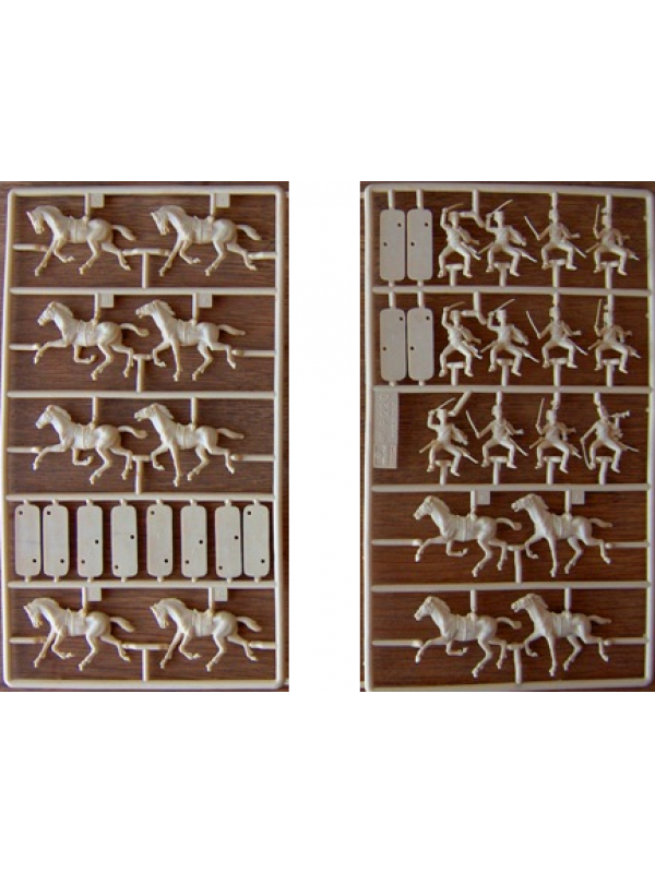 Scatola anni '80 sigillata contenente 36 pezzi con 12 soldatini a cavallo in plastica. Cavalleria Britannica Guerra di crimea Ussari